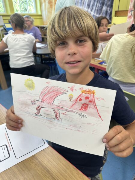 Older students explored the art of world-building, dreaming up imaginary places filled with extraordinary details. As Kevin added a horizon line to his picture, one student suggested, “Maybe you should also add a sun.” That simple suggestion opened up a great conversation about the time of day in the picture and how subtle details can help tell that story. Confidence grew as students not only contributed ideas to Kevin’s drawing but also began sketching their own imaginative worlds.