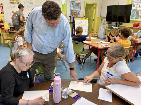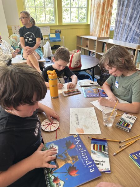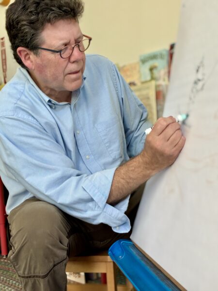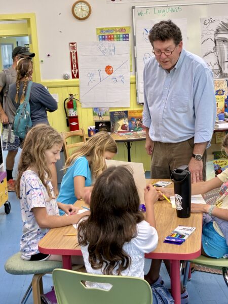 Kevin’s first presentation gathered all the island families together as he talked about his creative process—what inspires him, how he develops ideas, and how he brings stories to life through art. As he spoke, he filled sheets of easel paper with quick sketches that captivated everyone. His spontaneous drawings set the tone for the rest of the day, inspiring students (and adults!) to later create their own watercolor masterpieces.